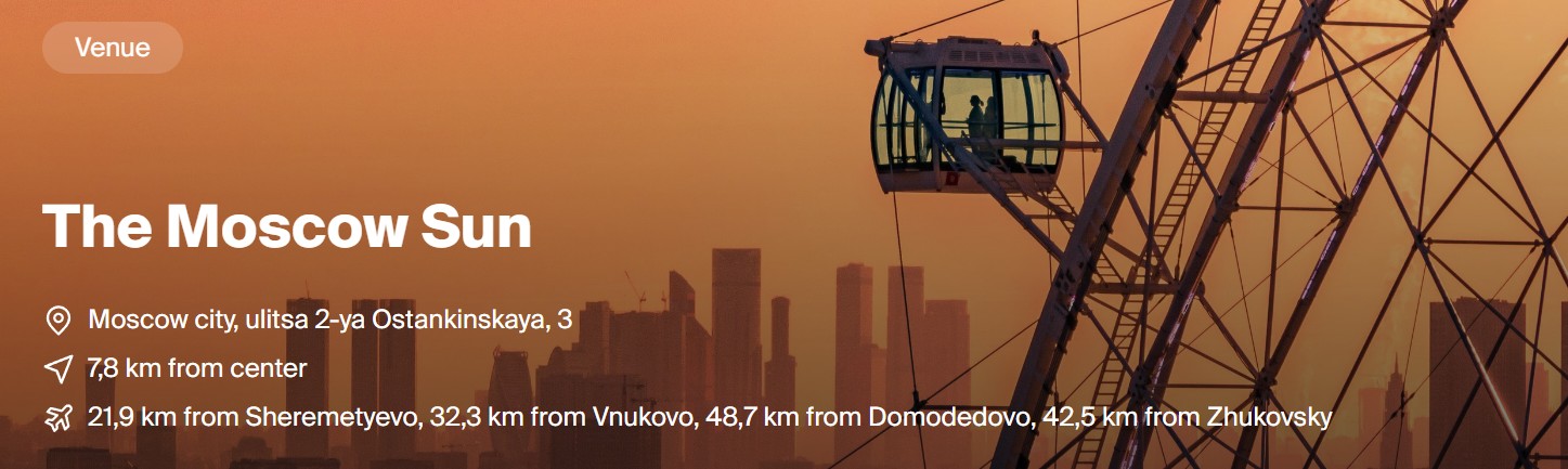 Moscow Sun คือแลนด์มาร์กแห่งใหม่ของกรุงมอสโก ที่เปิดโอกาสให้คุณสัมผัสจังหวะชีวิตของเมืองหลวงจากความสูงถึง 140 เมตร มองเห็นภาพรวมของเมืองและสถานที่สำคัญอันเป็นสัญลักษณ์ได้อย่างน่าประทับใจ