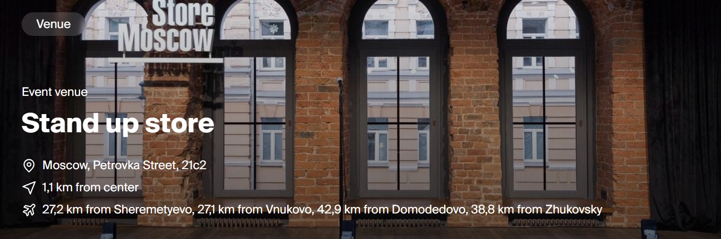 StandUp Store Moscow คือคลับสแตนด์อัพคอมเมดี้ชื่อดังในกรุงมอสโก ที่มีนักแสดงตลกแถวหน้าของประเทศขึ้นเวทีแสดง ทุกวัน ที่นี่ถูกออกแบบมาเพื่อสแตนด์อัพโดยเฉพาะ ด้วยบรรยากาศที่เป็นกันเอง อบอุ่น และสบายใจ ทั้งสำหรับผู้ชมและนักแสดง ทำให้ทุกเสียงหัวเราะเกิดขึ้นอย่างเป็นธรรมชาติ