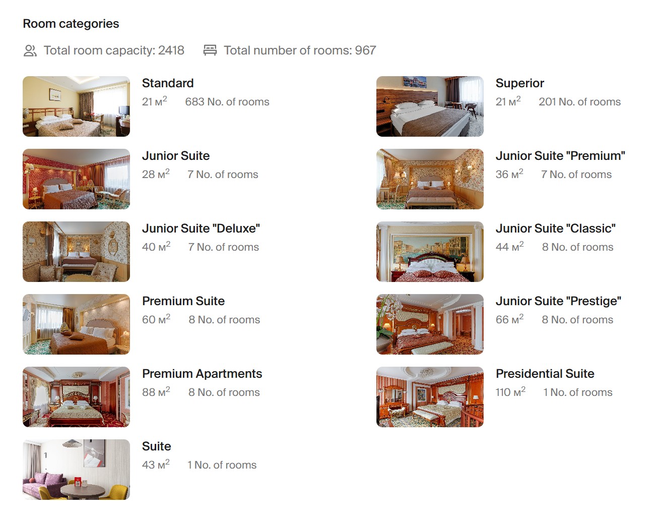 Hotel Alfa Izmailovo มีห้องพักจำนวนมากถึง 947 ห้อง ครอบคลุมหลากหลายประเภท ตั้งแต่ห้องมาตรฐานไปจนถึง Presidential Suite พร้อมมาตรฐานการบริการในระดับสูง และบริการเสริมที่หลากหลาย เหมาะทั้งสำหรับการพักระยะสั้นและการเข้าพักระยะยาว