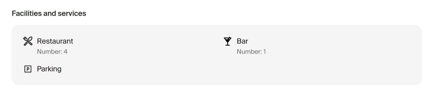 โครงสร้างพื้นฐานของโรงแรมได้รับการพัฒนาอย่างครบครัน ภายในมี ศูนย์ประชุมอเนกประสงค์ ที่ประกอบด้วยห้องประชุม 10 ห้อง, ห้องอาหาร 5 แห่ง, ล็อบบี้บาร์, ห้องจัดเลี้ยง 3 ห้อง, ไนต์คลับ รวมถึงคอมเพล็กซ์อาบน้ำชื่อดัง “Rimskie Termy” และสิ่งอำนวยความสะดวกอื่น ๆ อีกมากมาย
